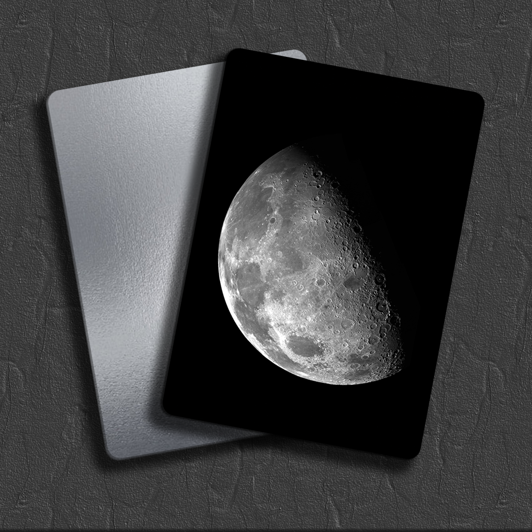Derin siyah arka plan, metal yüzeyin premium kalitesiyle birleştiğinde Ay sanki odanızın içinde parlıyormuş gibi inanılmaz bir derinlik hissi yaratır. 🔭